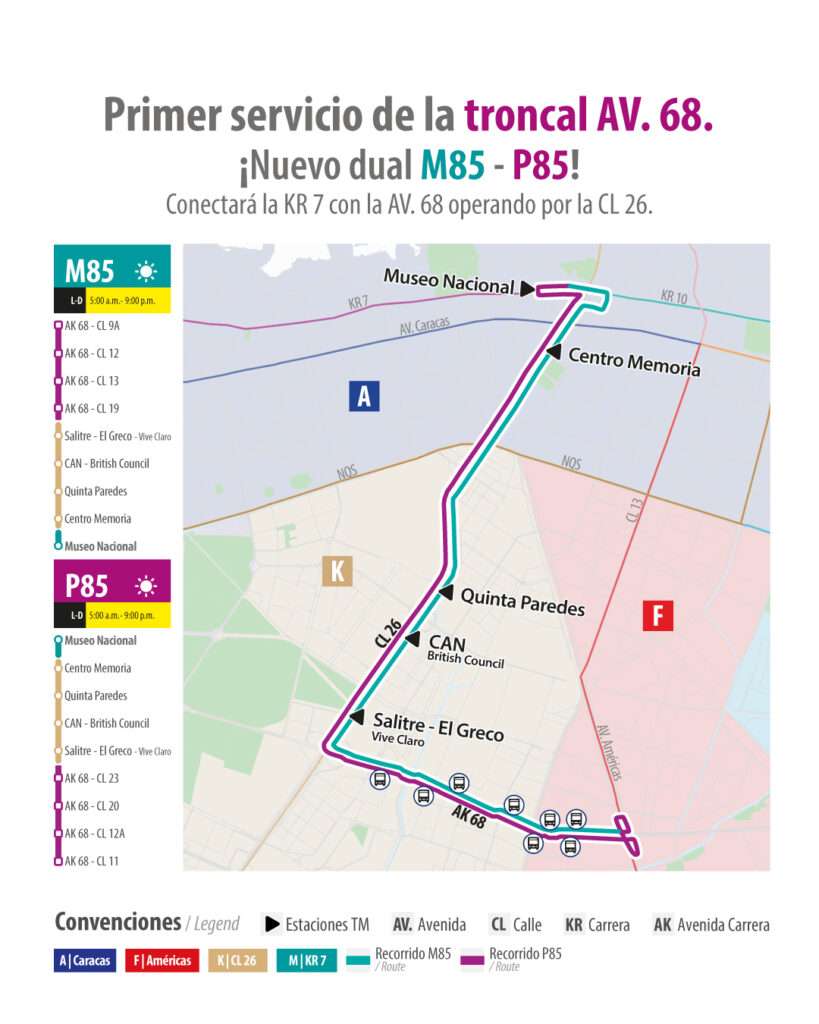 La ruta MP85 se convierte en el primer servicio que operará en la futura troncal de la avenida 68, conectando de manera directa el occidente de la ciudad con el centro, a través de un corredor que integra la avenida Las Américas, la calle 26 y el Museo Nacional.