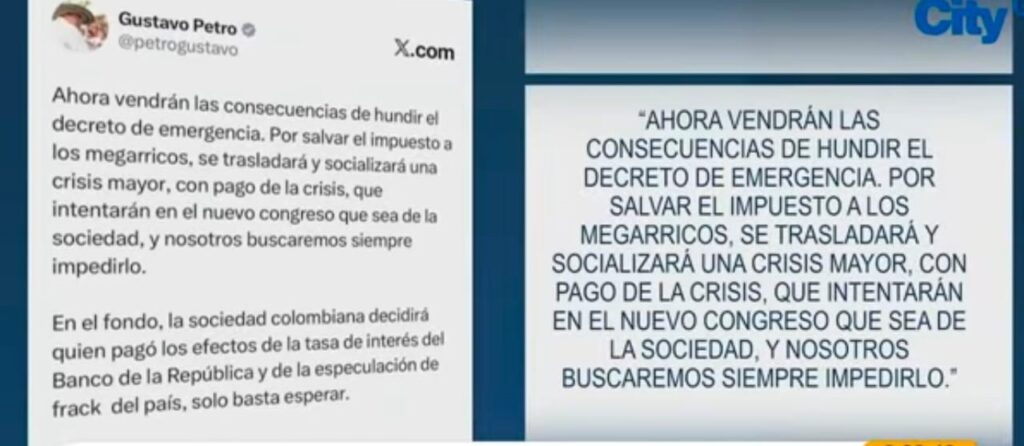La decisión generó fuertes reacciones. El presidente Gustavo Petro se pronunció en redes sociales señalando que la suspensión del decreto tendrá consecuencias fiscales y sociales, y aseguró que la Corte estaría protegiendo intereses de los sectores más ricos del país.