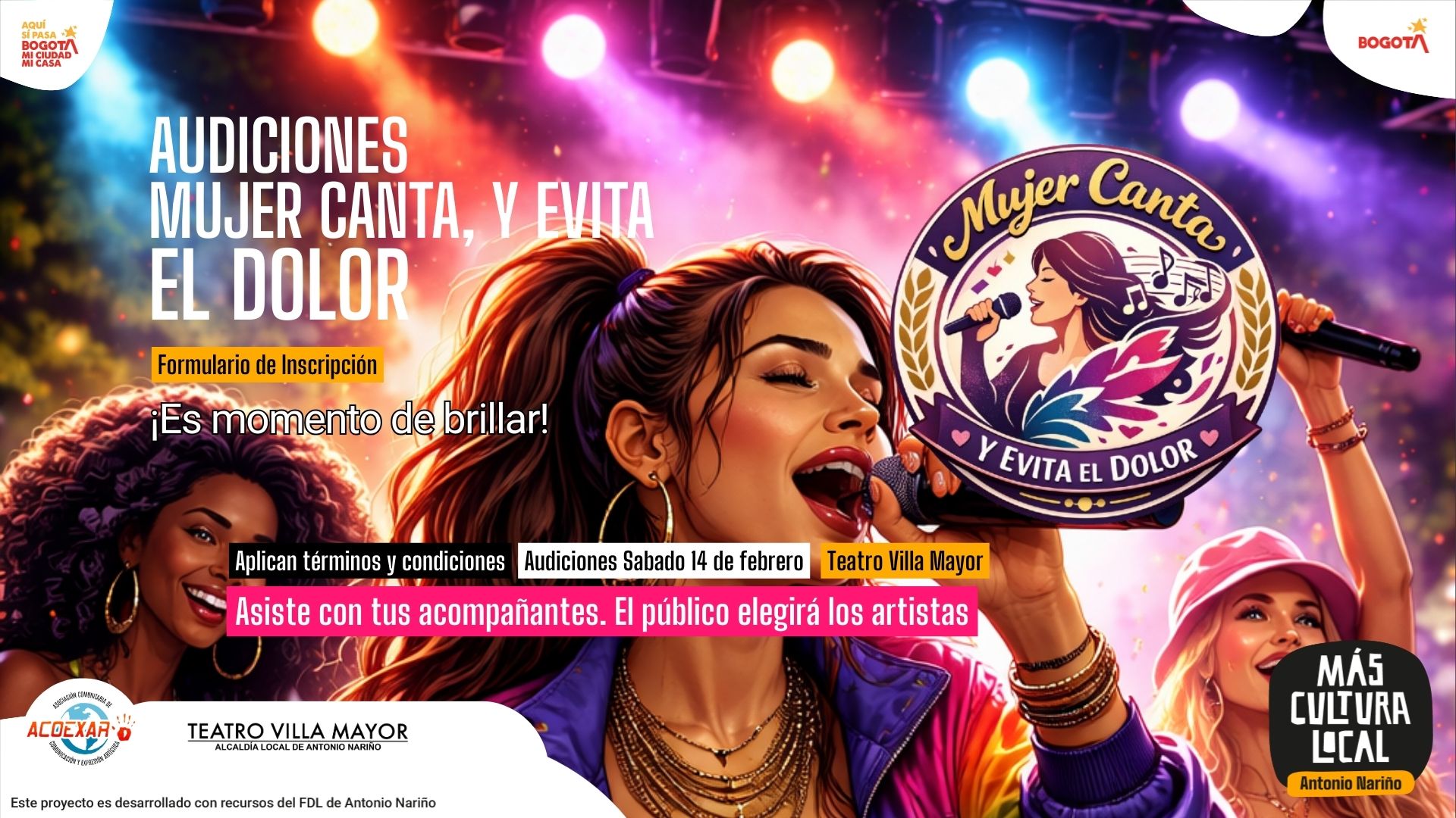 Una jornada cargada de talento, música y expresión artística se vivirá este sábado 14 de febrero desde las 2:00 de la tarde, cuando el Teatro Villa Mayor, ubicado en la localidad de Antonio Nariño, abra sus puertas para una audición pública de artistas urbanos, en el marco del proceso cultural “Mujer Canta y Evita el Dolor”.