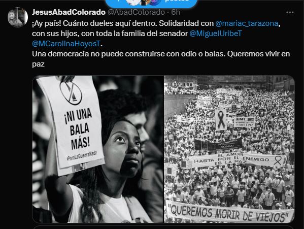 Concluyó con este mensaje de Jesús Abad Colorado, colega y fotógrafo, un ser a quien admiró pues a través de su labor de retratar la crudeza de nuestro sociedad nos invita a reflexionar. «¡Ay país! Cuánto dueles aquí dentro. Solidaridad con @mariac_tarazona, con sus hijos, con toda la familia del senador @MiguelUribeT @MCarolinaHoyosT. Una democracia no puede construirse con odio o balas. Queremos vivir en paz».